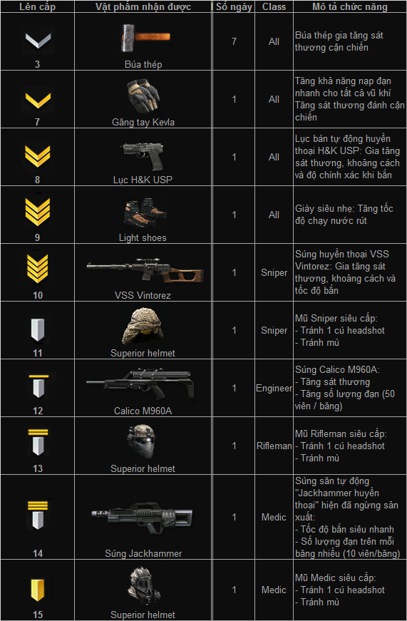 Khi tham gia sự kiện này, bạn sẽ nhận được những món quà độc đáo như Búa Sắt có thời hạn lên tới 7 ngày (vũ khí cận chiến ingame mặc định đang là Búa Gỗ) hay những khẩu súng với tính năng khác biệt. Quà khủng chưa từng xuất hiện trong game lại được nhận nhiều lần, bạn sẽ không thể tìm thấy chúng ở bất kỳ đâu khác, chỉ có thể là Thăng Cấp Nhận Quà mà thôi.